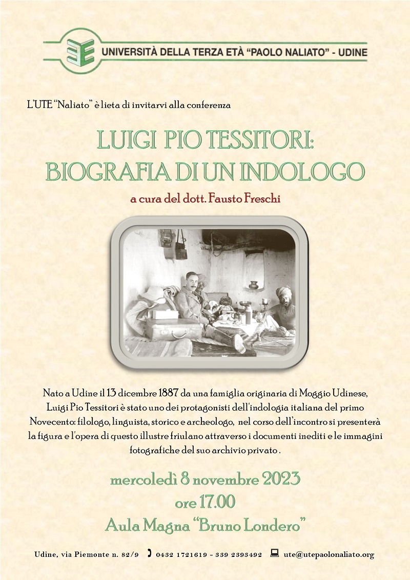 Nato a Udine il 13 dicembre 1887 da una famiglia originaria di Moggio Udinese, Luigi Pio Tessitori è stato uno dei protagonisti dell’indologia italiana del primo Novecento: filologo, linguista, storico e archeologo, nel corso dell’incontro si presenterà la figura e l’opera di questo illustre friulano attraverso i documenti inediti e le immagini fotografiche del suo archivio privato.