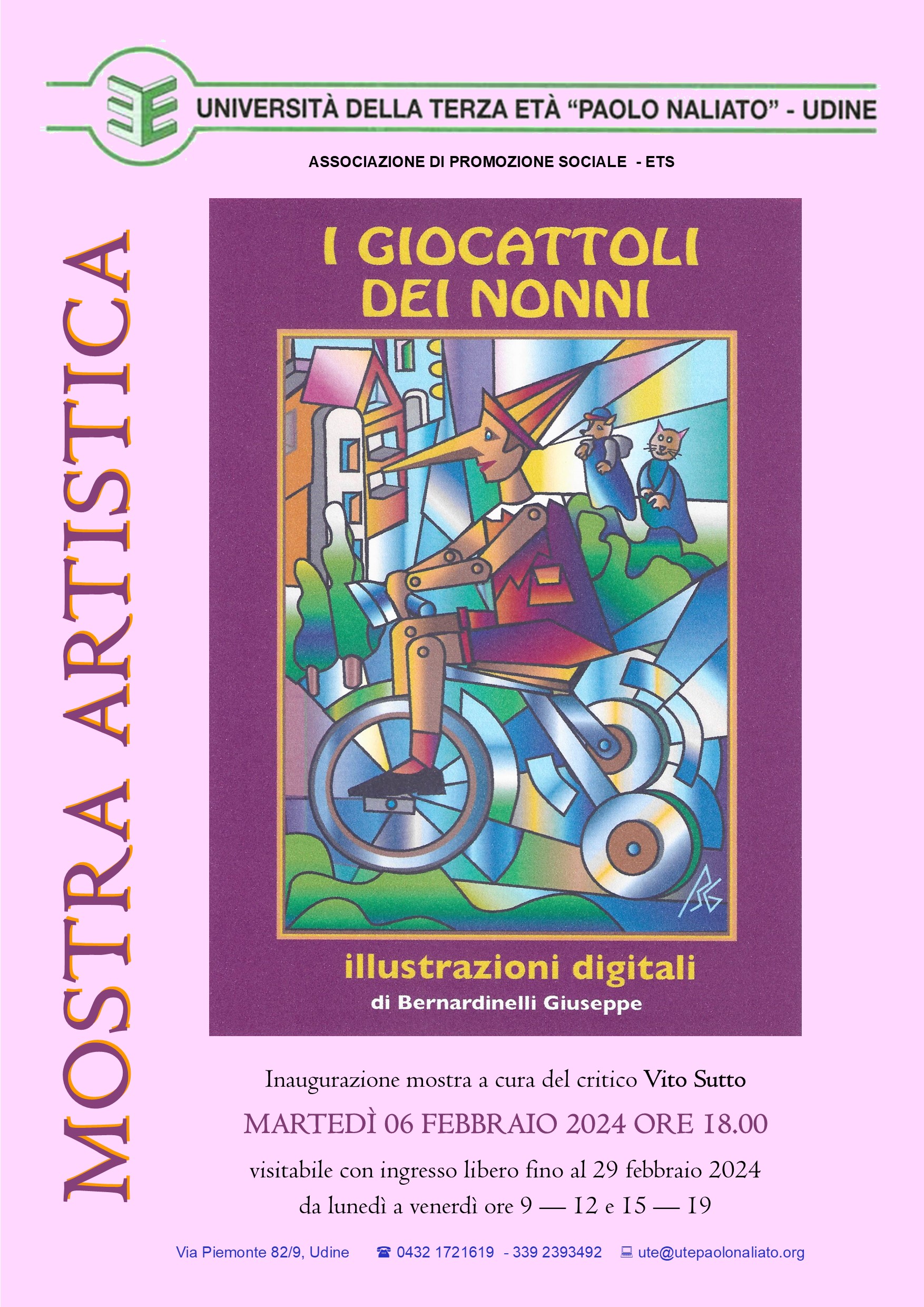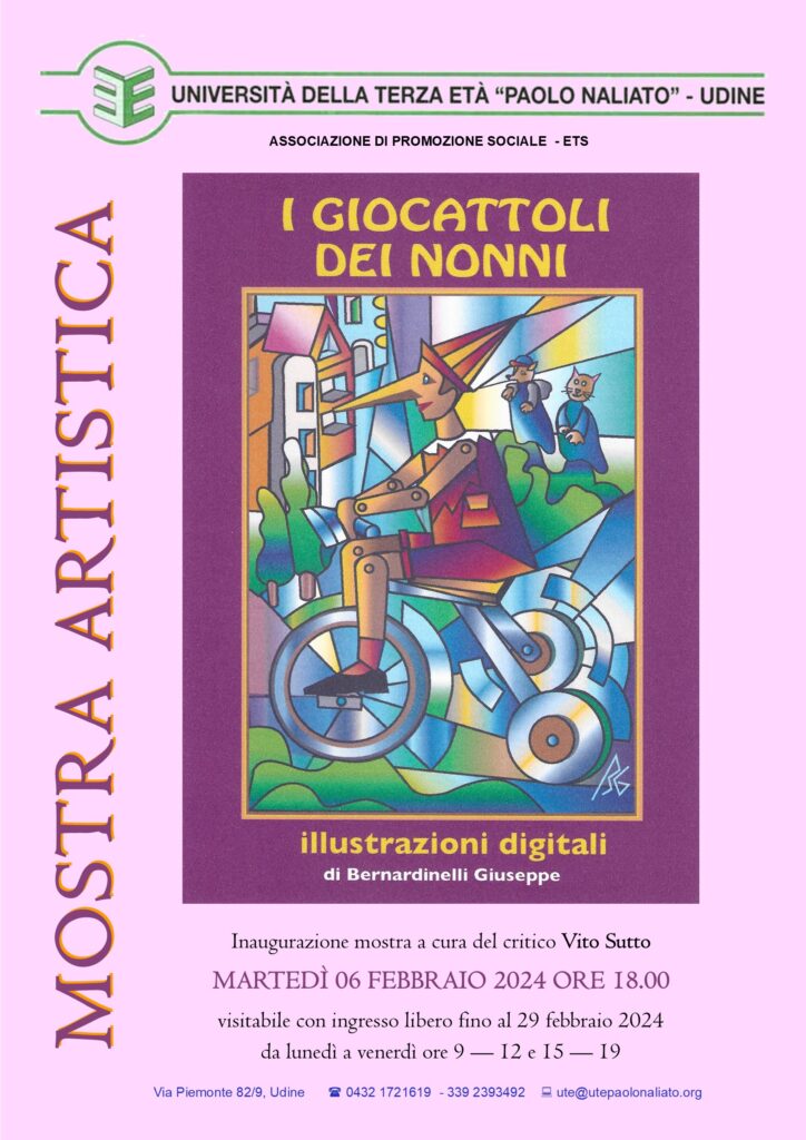 I Giocattoli dei nonni; Doc. Bernardinelli Giuseppe ; Conclusione Admin Calendario, conferenze Febbraio 5, 2024Febbraio 7, 202420240206, 20240229 Inaugurazione mostra a cura del critico Vito Sutto MARTEDÌ 06 FEBBRAIO 2024 ORE 18.00 visitabile con ingresso libero fino al 29 febbraio 2024da lunedì a venerdì ore 9 — 12 e 15 — 19