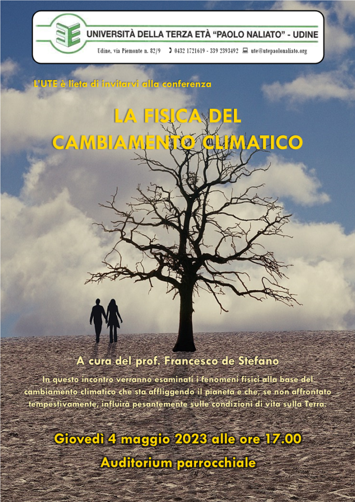In questo incontro verranno esaminati i fenomeni fisici alla base del cambiamento climatico che sta affliggendo il pianeta e che, se non affrontato tempestivamente, influirà pesantemente sulle condizioni di vita sulla Terra.
