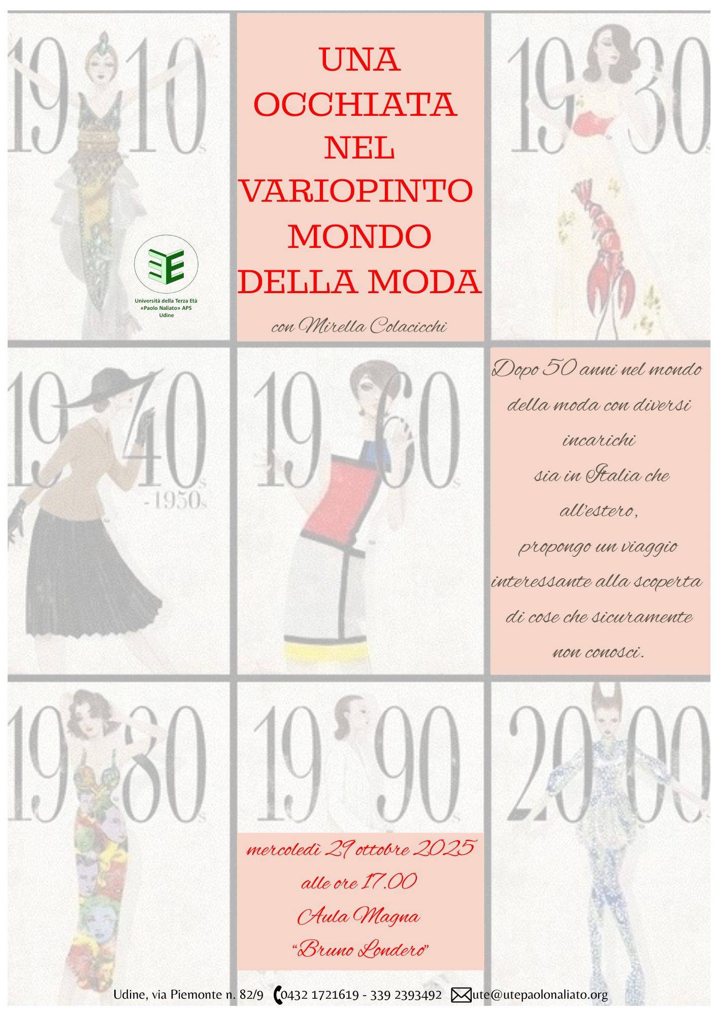 Mercoledì 29 Anna Colacicchi introduce il corso sulla storia della moda che inizierà il prossimo novembre: dopo cinquant’anni nel mondo della moda in Italia e all’estero, si propone un viaggio interessante all’interno di un mondo molto spesso sconosciuto..